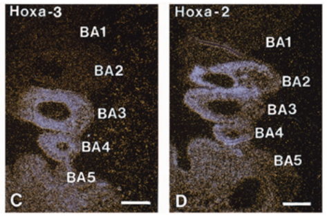 Chez les Vertébrés, l’expression des gènes Hox posent des frontières conservées au cours de l’évolution. Par exemple, la limite d’expression antérieure de Hoxc6 correspond à la transition entre les vertèbres cervicales et les vertèbres thoraciques, quelque soit le nombre de vertèbres cervicales ou thoraciques chez les différentes espèces (Böhmer, 2017). Cette limite d’expression est notamment nettement plus postérieure chez les Oiseaux que chez les Mammifères, les Oiseaux ayant en général deux fois plus de vertèbres cervicales que les Mammifères.