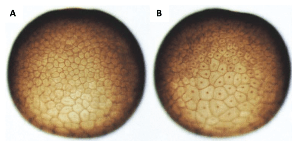 60 ans après l’expérience de Spemann et Mangold, Gimlich et Gerhart ont montré en 1984 qu’on pouvait reproduire la production d’un deuxième axe dorsal en greffant un macromère végétatif dorsal (une cellule destinée à donner de l’endoderme dorsal) du côté ventral d’un embryon au stade 32 cellules.